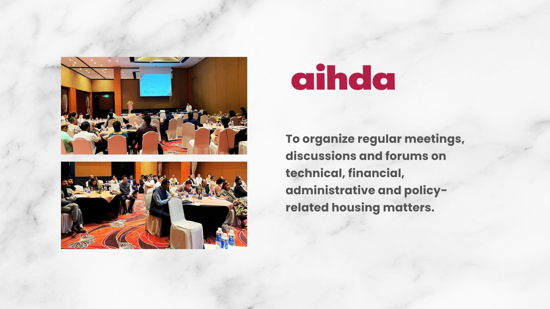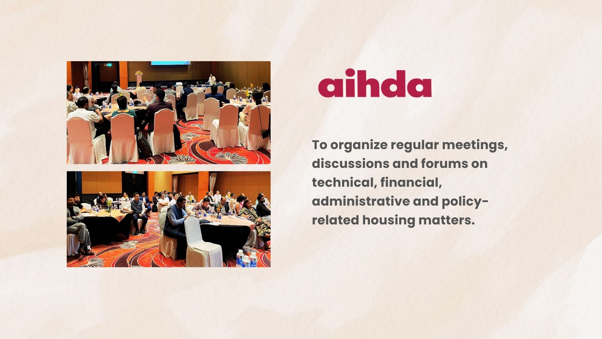 AIHDA provides a unified platform for organizations and professionals in the housing sector to collaborate, share knowledge, and address key challenges in housing development. It promotes standard practices, improved planning, design, construction, administration, and maintenance of housing projects. AIHDA conducts discussions on technical, financial, and administrative issues, undertakes consultancy assignments, prepares project reports, and supports capacity building through training, skill enhancement, and knowledge updation in the field of housing and human habitat development.